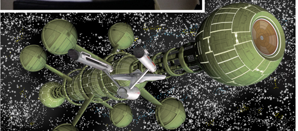 That's me with a miniature we built for the Star Trek: Voyager episode "Lifesigns" (1996). It is part of the Utopia Planitia fleet yards on Mars. The New York State Pavilion influence is evident.