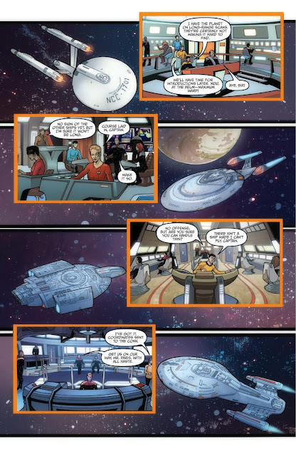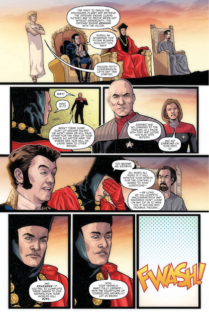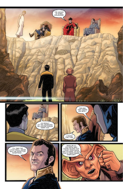 The series comes from writers Scott and David Tipton, with art by David Messina, who also provides both the A and B covers, which themselves continue a series begun withthe covers from the first issue, framing an assortment of the main cast characters inside the bodies of their superbeing overseers, in this case Trelane and a Metron. A further retail incentive cover, featuring a sculptural Captain Picard, comes from George Caltsoudas.