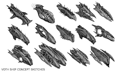 ...we took note of visual elements that were symbiotic between the two canonical ships. A variety of these elements were isolated and used to create a visual design language for the Voth’s ships. We created this language knowing that we would have to create anywhere from three to five new Voth ships. This acted as a strong stepping stone for deciding where to start.Here are some of the concepts they came up with: