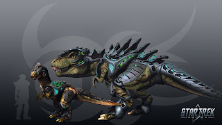 "Doctor Grant, my dear Doctor Sattler, welcome to..." uh, Star Trek Online! Yup, dinosaurs are coming to Star Trek Online, as combat companions to the Voth in the new Dyson Sphere story line. They don't actually have a T-Rex; sixty-five million years after that species presumably left Earth in the Voth zoo-ship, its descendent, the Viriosaurus Rex is one of three "bio-engineered dinosaurs" the Voth have also equipped with armour and weapons to help in combat situations. STO's Designing the Voth blog post beautifully summed up the role of dinosaurs in the game: