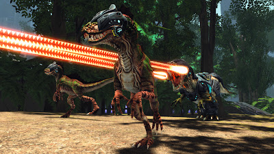 At one point our Lead Designer, CaptainGeko, said, “all I want is dinosaurs with frickin’ laser beams on their heads!” We all chuckled, and then he said, “I’m being serious; this is a game. Let’s have some fun!”While the Viriosaurus Rex is the Voth's cyber-dino tank, he is joined by the smaller Dankanasaurs, which are "raptor-like dinosaurs used by the Voth as shock troops and terrifying swarmers", and Furiadons, "larger alien raptors with higher cognitive abilities than the animalistic Dankanasaur". You can read more about them in STO's Voth ground combat post. Here they are in action: