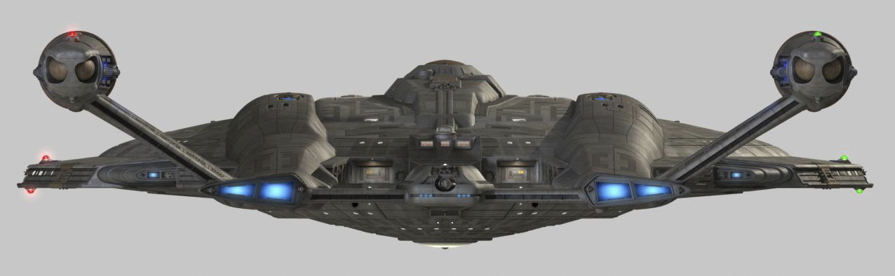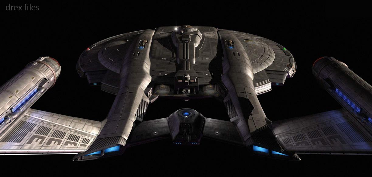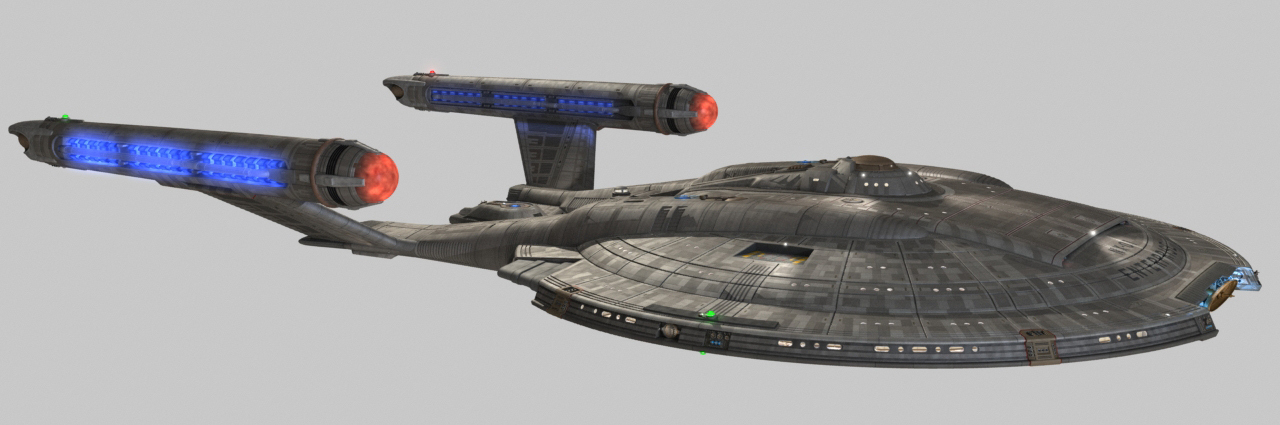 Here is nearly the same angle but with the ambient turned down, the the key turned up, and a bigger lens. Notice how the larger lens stacks things up a bit, and flattens them out. These lighting conditions push the plate detail back, and emphasize the ship’s self light and luminosity. Truth be told, the fronts of the bussard collectors are too red and lazy for my taste. I would have pushed to the orange side and had a much more volatile and seething kinetic look there like TOS. It was not to the taste of our bosses. I found (and all due respect), that during the Berman years, anything brassy, meaning what they perceived as loud, was pushed into the background. The musical score became wallpaper, and colors were desaturated. One day I came into the living room, and Enterprise was on… Hey! What’s wrong with the TV? There’s no color!… Then someone walked onto the scene in the blue uniform. Oh! The color IS on! It’s just that Enterprise was shot in all blues and greys. Very monochromatic. Anything colorful was crushed out of the picture.