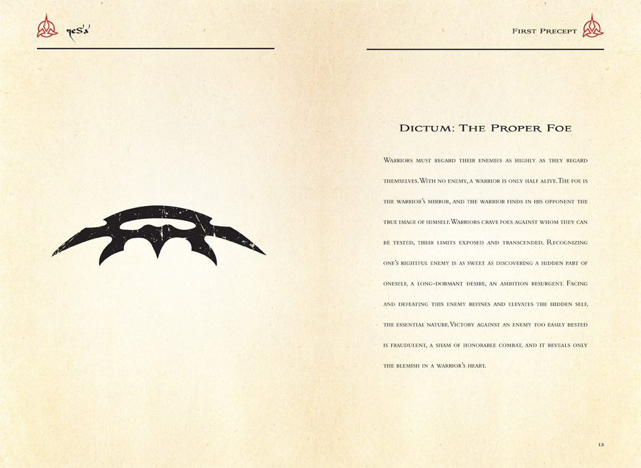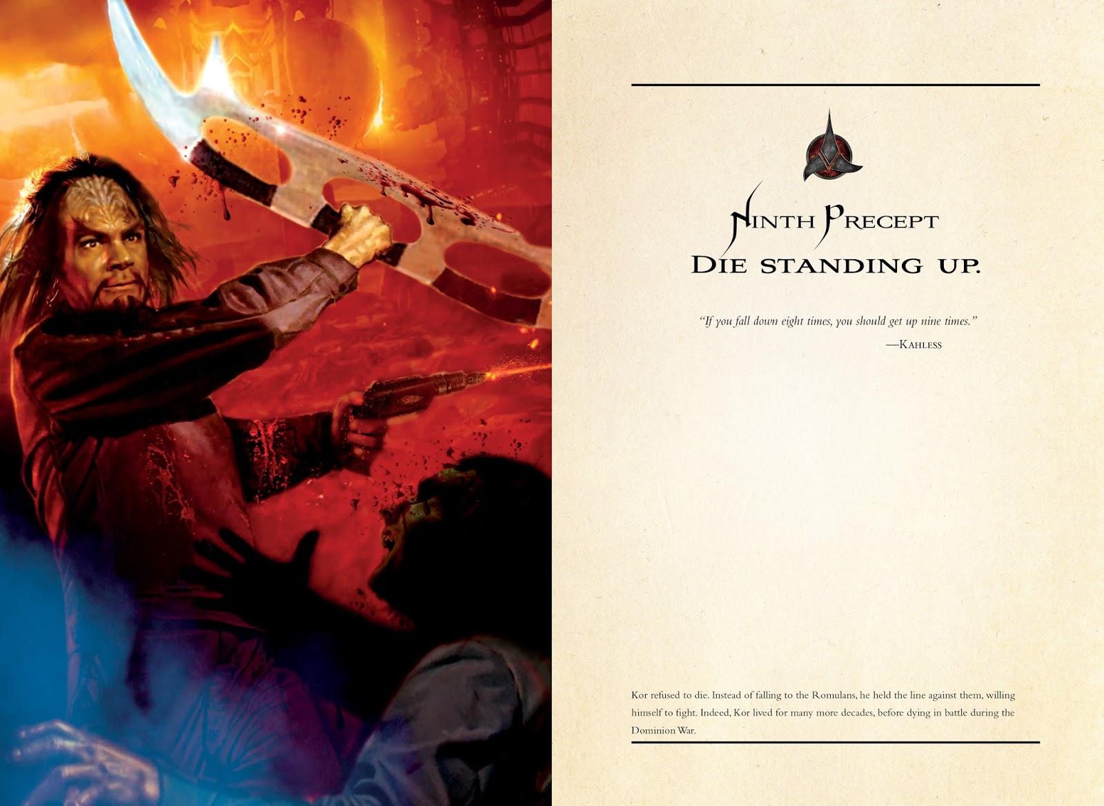 In the book DeCandido guides us through Kahless' ten precepts; giving his original Klingon commandments, presented alongside numerous examples of the principles in action, from ancient pre-Kahless times, through to the Destiny-era of the 24th century novelverse.