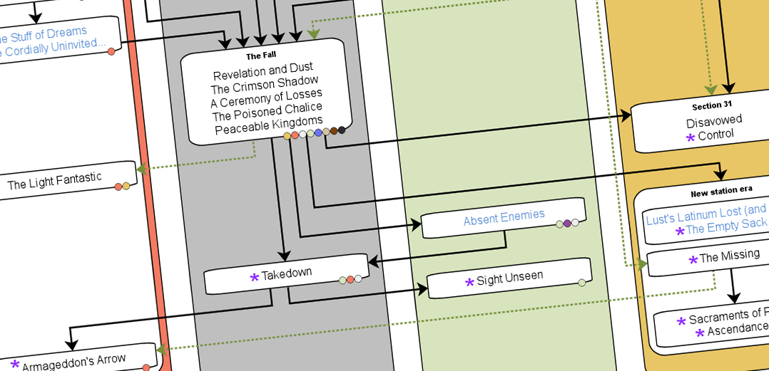 We've added in all the latest releases and known upcoming books, with the biggest expansions coming after The Fall. The most notable change is that the DS9 column now extends the full height of the chart, thanks to the recent resurgence in DS9 books; there's quite a pleasing cluster of adventures on the new station now building up.